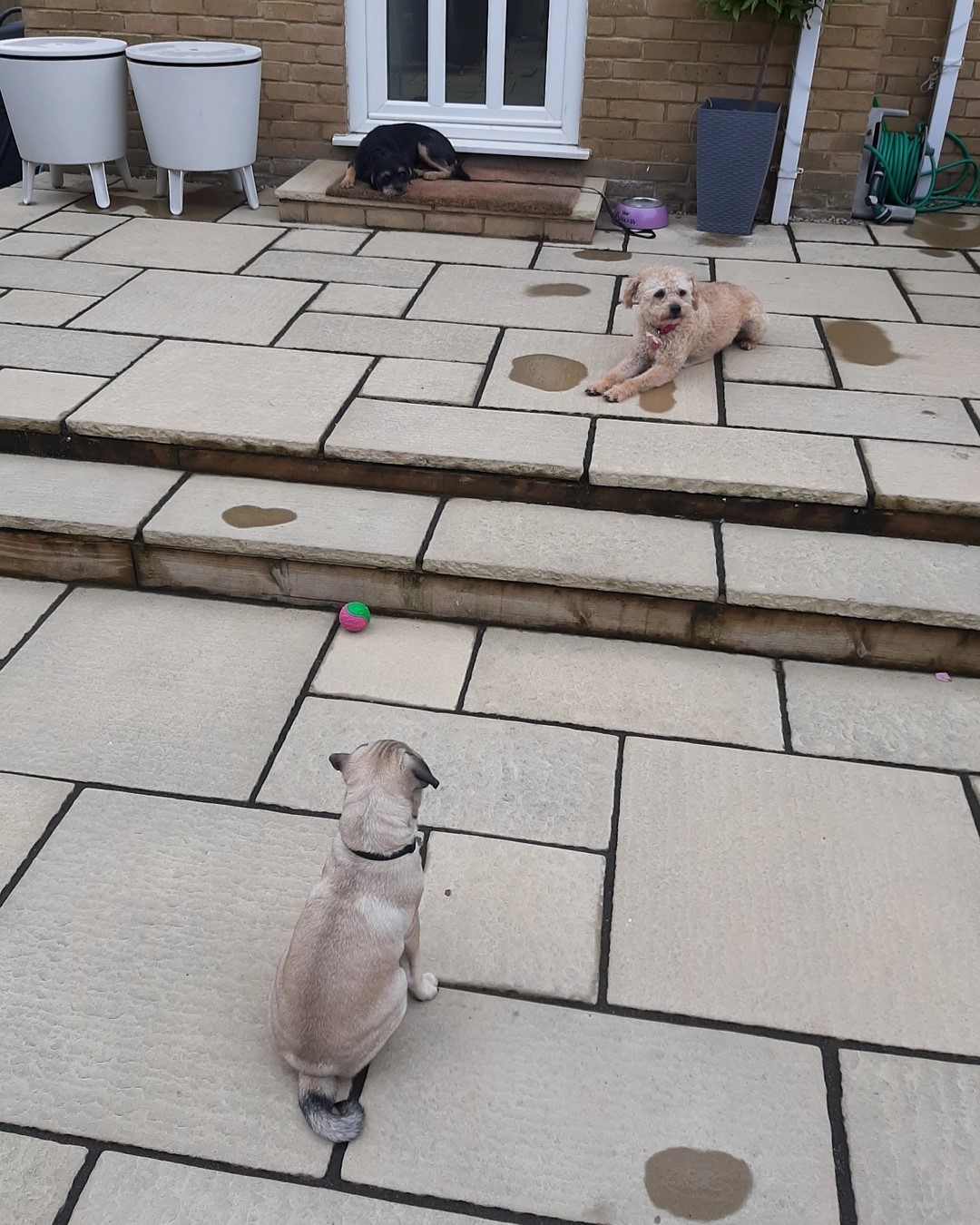 Meet George, Mable and Rupert at their introduction session. Their humans had been having challenges introducing new Pug pup Rupert but as you can see that after a small skirmish with older boy George an understanding had been reached. Early days but a great start.